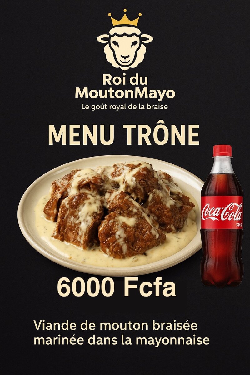 500g de mouton braisé mariné à la mayonnaise royale, accompagné dattiéké et dune boisson Coca-Cola 50cl. Le choix des vrais rois du goût