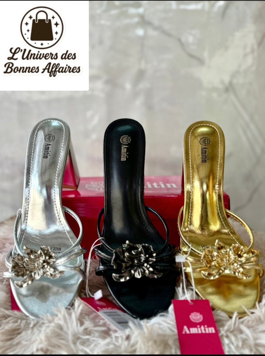 Découvrez nos mules brillantes en métal, idéales pour toutes occasions spéciales. Confortables et chic, elles sont ornées de détails floraux raffinés. Parfaites pour ajouter une touche glamour à votre tenue de soirée ou un événement festif. Disponibles en argent, noir et or.