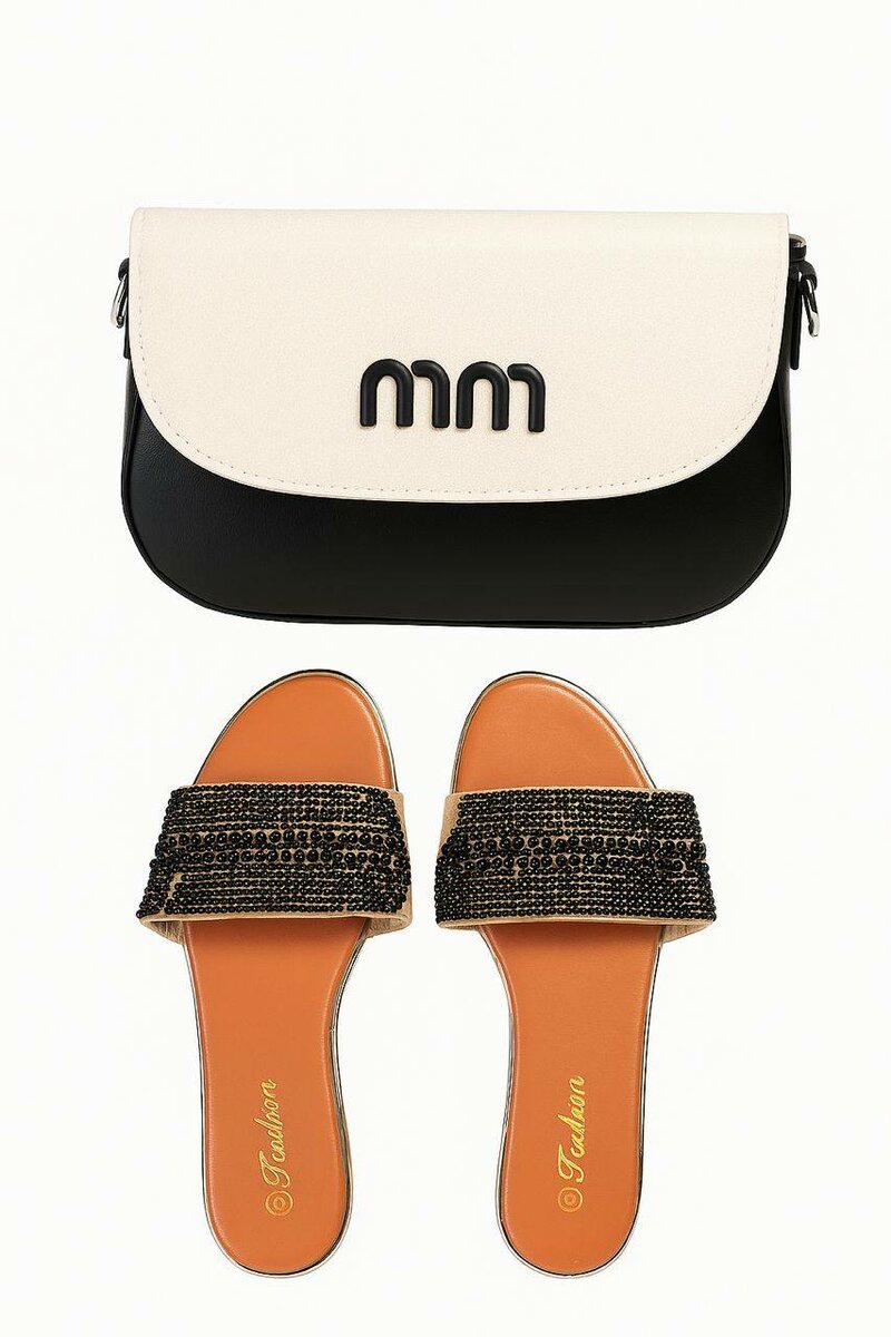 Mules chics avec strass noirs et pochette assortie. Parfaites pour un look sophistiqué en soirée ou en ville. Confort et style réunis.