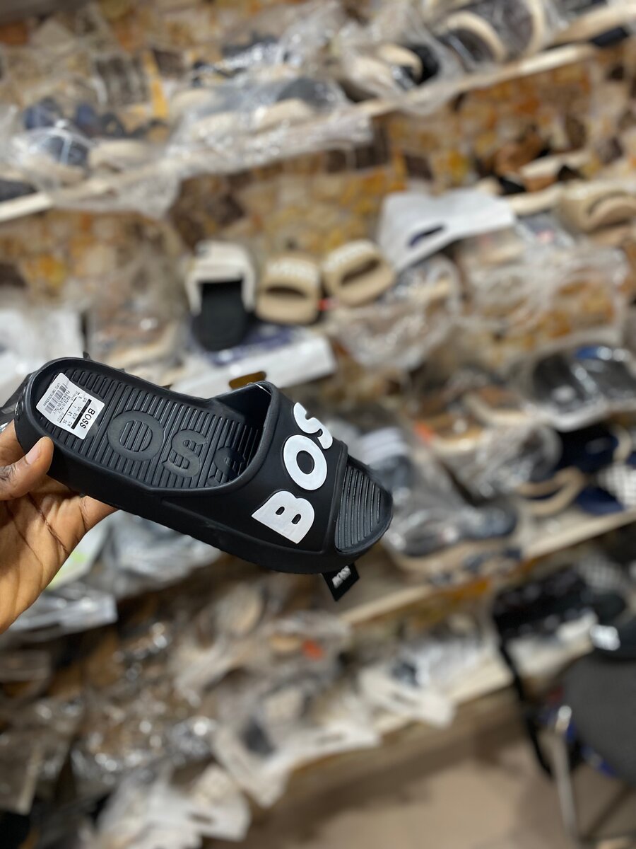 Mules confortables pour homme en caoutchouc noir avec inscription 'Bo*'. Parfaites pour la maison ou la plage. Semelle antidérapante pour une sécurité maximale.