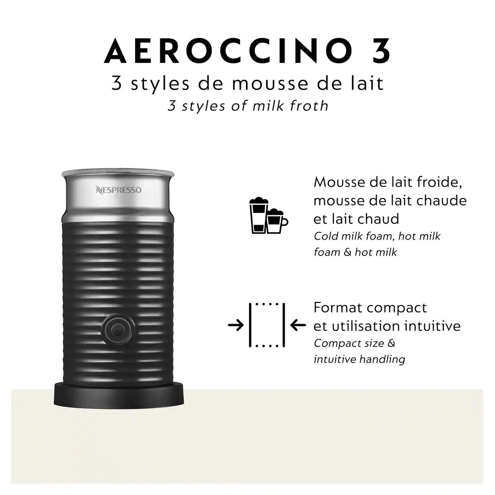 Nespresso AEROCCINO 3 Avec son moteur puissant et efficace, Nespresso vous propose un mousseur à lait.. A chaud ou à froid, faites mousser votre lait pour obtenir un bon café onctueux, en cappucino ou plus.