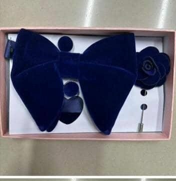 Élégant ensemble de noeud papillon bleu marine en velours, comprenant une rose et des boutons de manchette assortis. Parfait pour les occasions spéciales comme un mariage ou une soirée de gala.