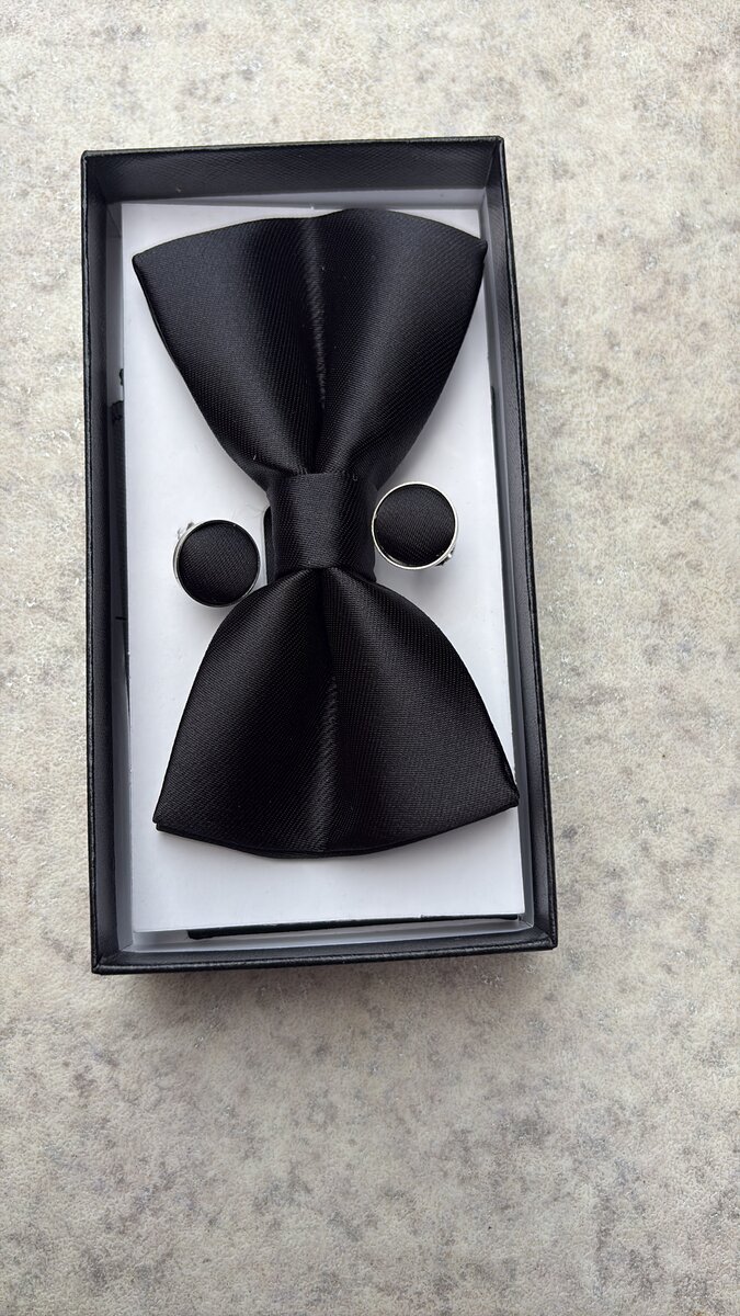Ensemble élégant de noeud papillon et boutons de manchette en satin. Disponible en bleu, noir et beige. Livré dans une boîte cadeau. Parfait pour les hommes pour une occasion spéciale.