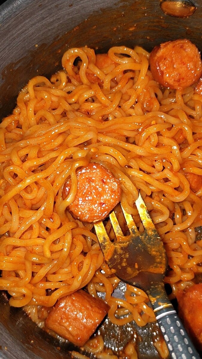 Plat de nouilles épicées avec morceaux de saucisse tendre. Délicieux et rapide pour un repas complet.
