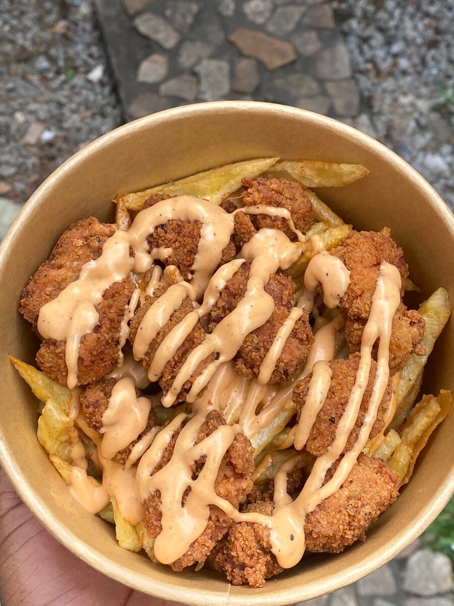 Découvrez notre délicieux plat de nuggets de poulet croustillants, accompagnés de frites dorées et de sauce de fromage.Parfait pour un repas rapide et savoureux. Idéal pour les amateurs de repas réconfortants.