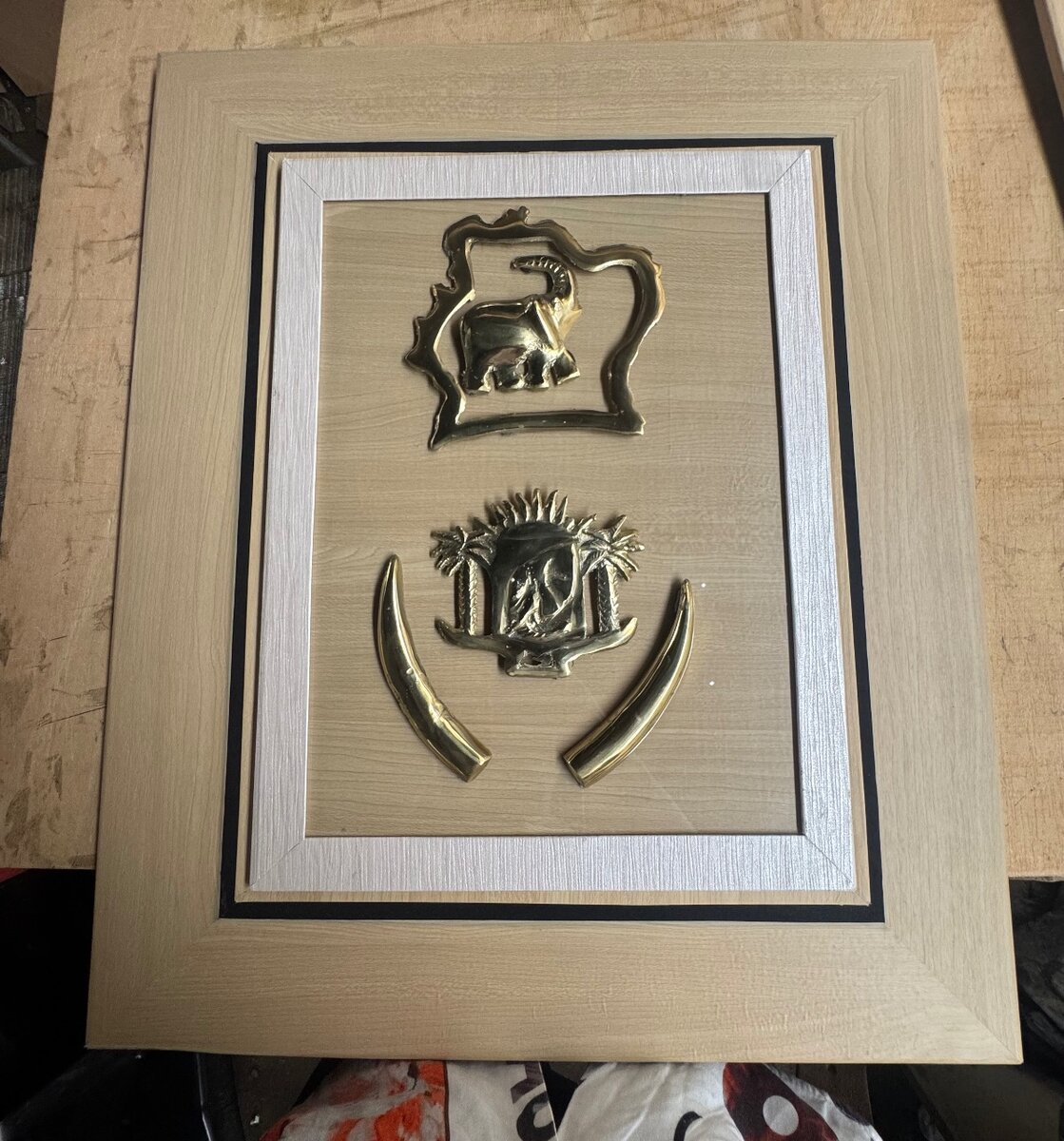 Œuvre dart africain avec un beau tableau élégant en bronze accompagné des éléphant de la côte-divoire , avec les ivoires , lemblème du pays et la carte du pays . génial toute est en bronze