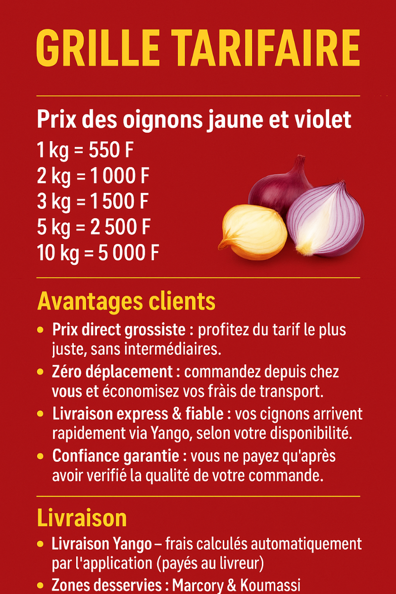 Optez pour nos oignons frais vendus à prix de gros, livrés directement à votre domicile à Marcory et Koumassi. Profitez de la livraison rapide et du paiement après vérification. Parfait pour vos besoins culinaires quotidiens.