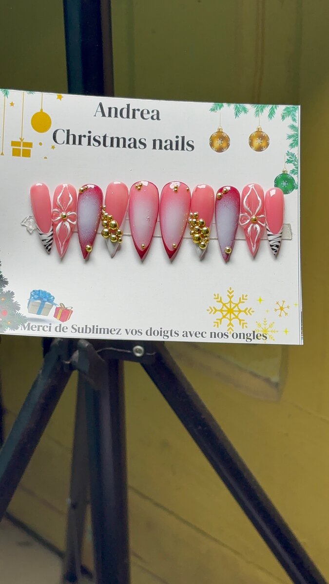 Transformez vos ongles pour Noël avec l'élégance festive des faux ongles Andrea. Design sophistiqué avec des teintes rouges et ornements dorés, parfait pour les fêtes. Facile à appliquer, durable, idéal pour sublimer vos tenues de Noël.