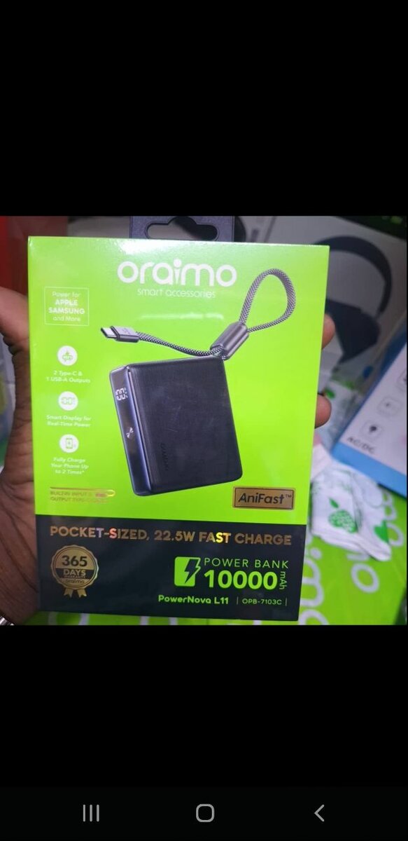 Rechargez vos appareils rapidement avec ce Power Bank Oraimo 10000mAh. Compact et efficace, idéal pour les voyages et les déplacements quotidiens.