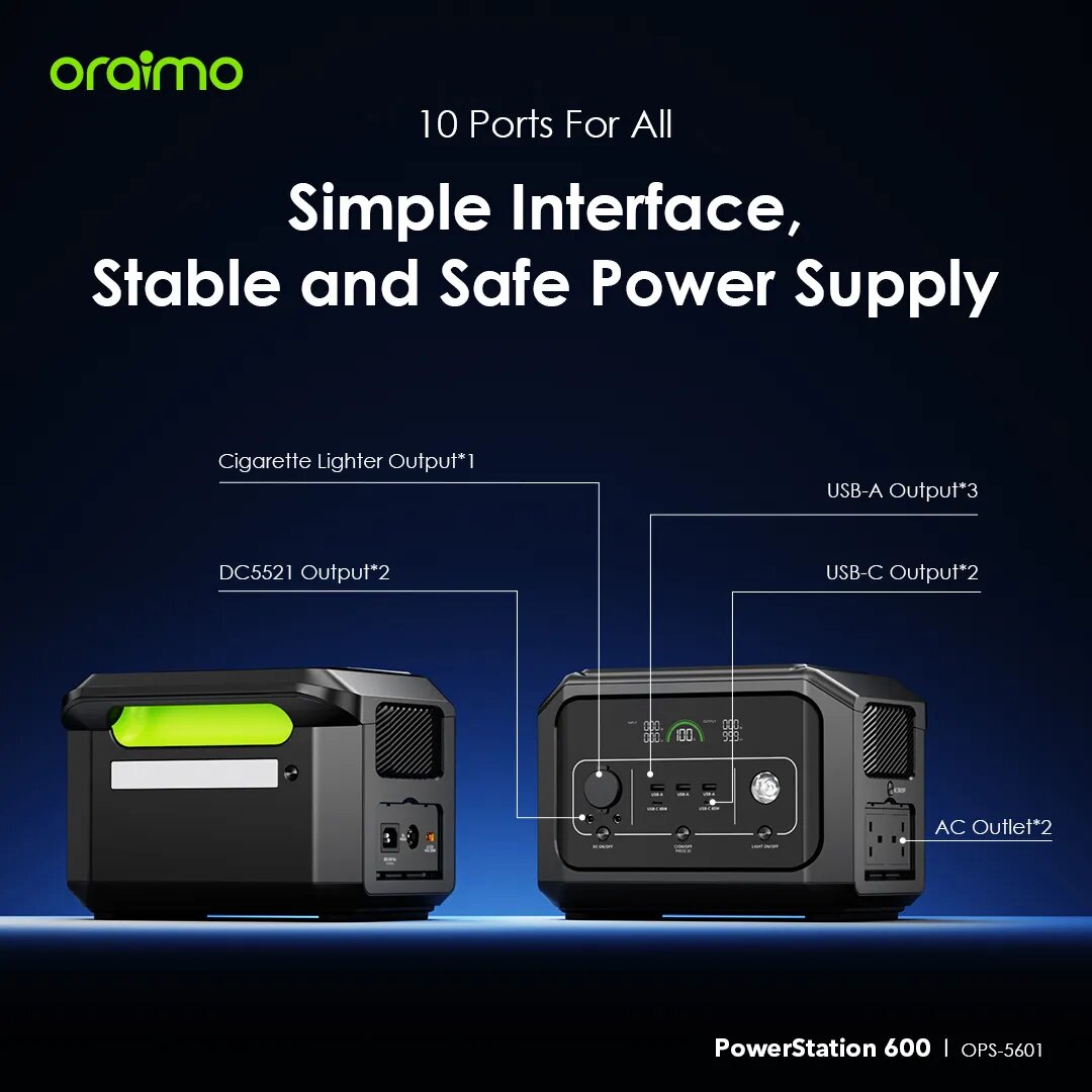 La centrale électrique Oraimo PowerStation 600W est un choix idéal pour des besoins d'alimentation continue avec 10 ports polyvalents. Ses modes d'éclairage double et son interface simple en font un outil parfait pour le camping et les voyages. Fournit une alimentation sécurisée et stable pour réfrigérateurs, lampes et plus.