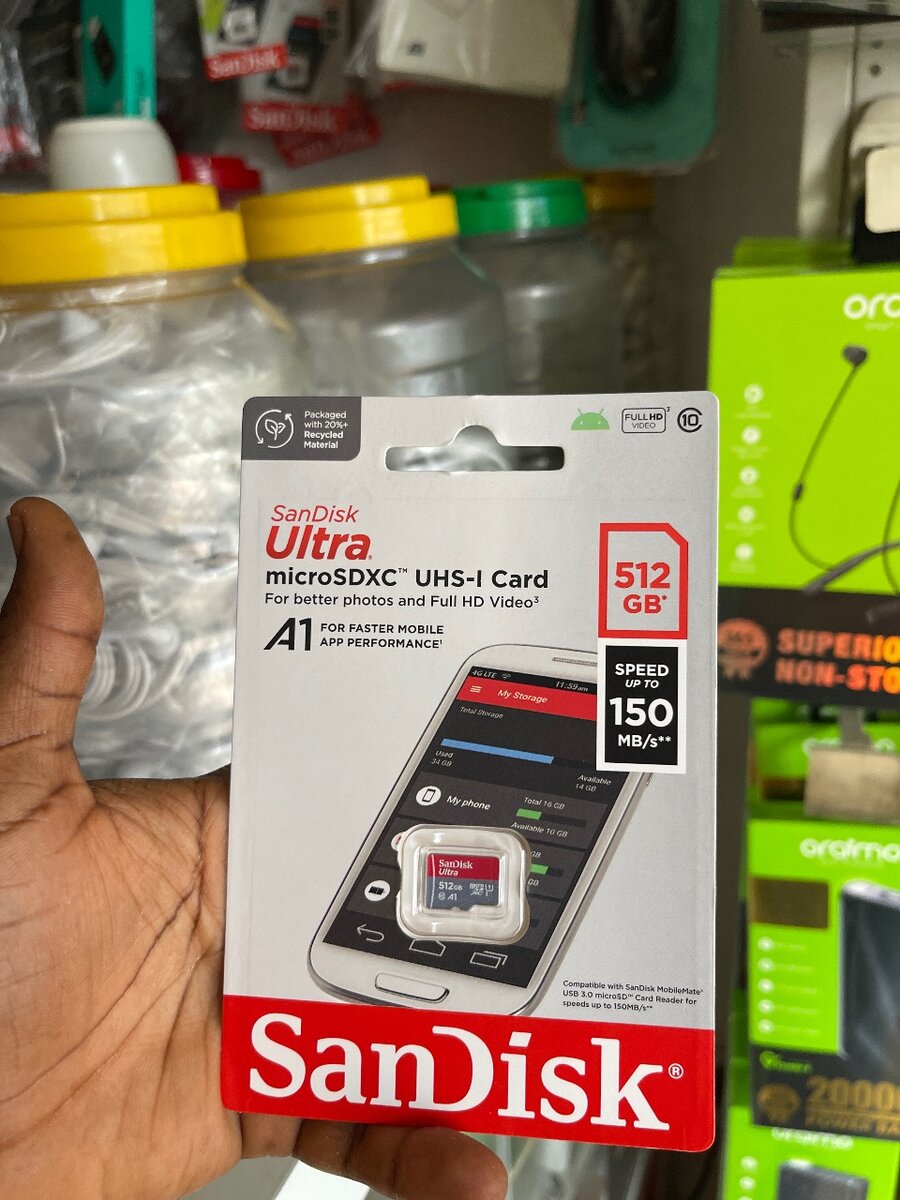 Original Sandisk memory card 512gb compatible with all Android devices,PC, Camera (with adapter) and iPhones (with OTG adapter). 100mb/s speed for faster files transfer. we offer delivery service.