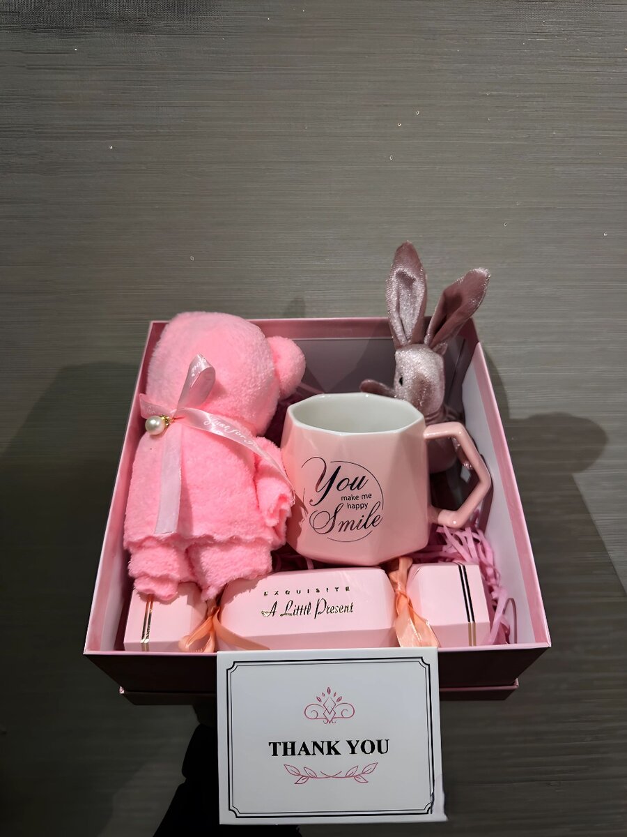 Уникальный набор в розовой коробке идеальный подарок для любимой, подруги или коллеги! Включает плюшевое полотенце в форме мишки, кружку с надписью "You make me happy Smile", плюшевого кролика, элегантную коробочку для украшений и открытку "Спасибо". Все в нежных розовых тонах для атмосферы уюта и романтики. Есть другие варианты на любой вкус порадуйте близких и создайте особенные моменты!