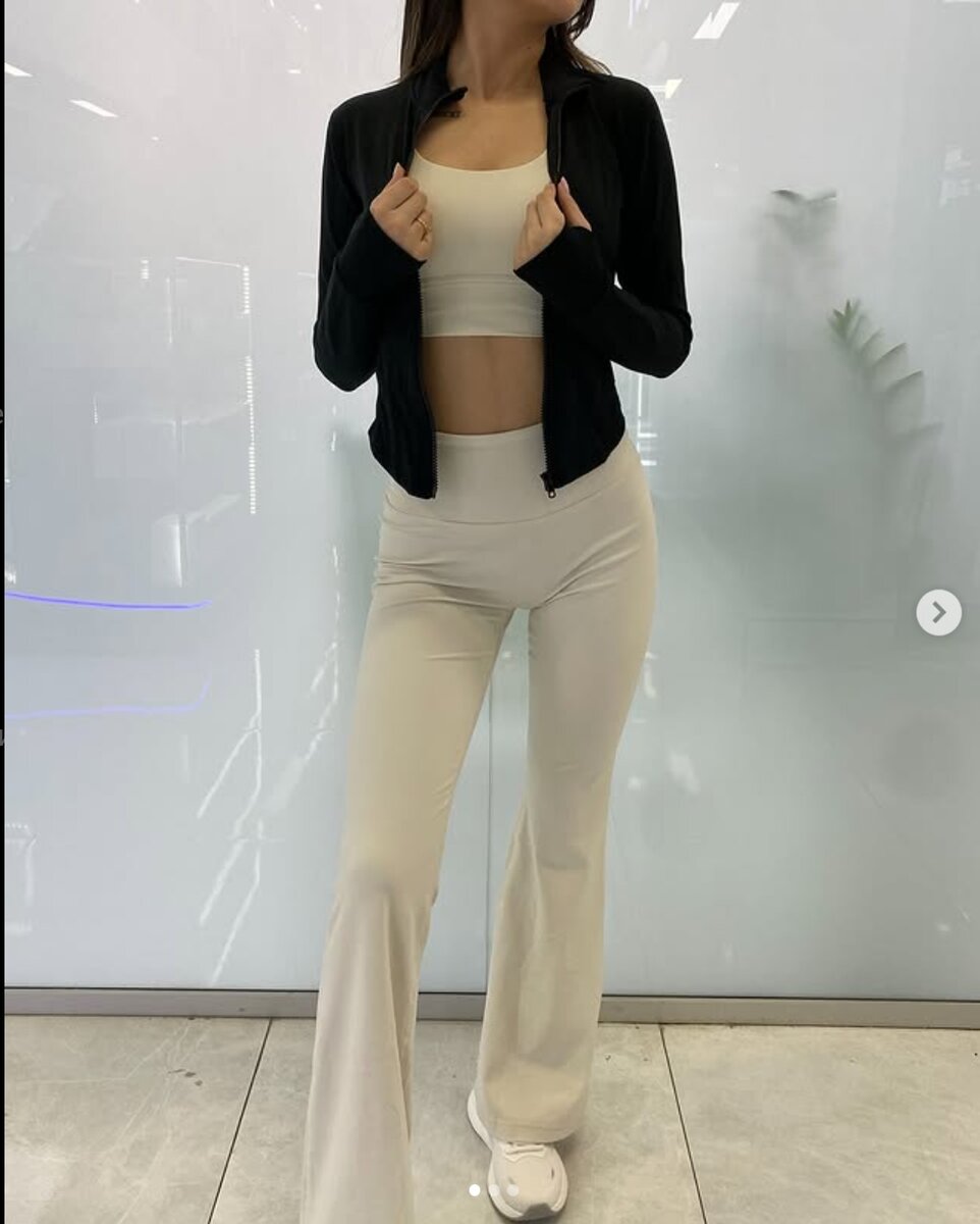 Этот спортивный сет — идеальное сочетание элегантности и удобства. Бежевый комплект из топа и расклешенных леггинсов подчеркивает фигуру и обеспечивает максимальный комфорт, а черный укороченный рашгард добавляет стильный акцент.