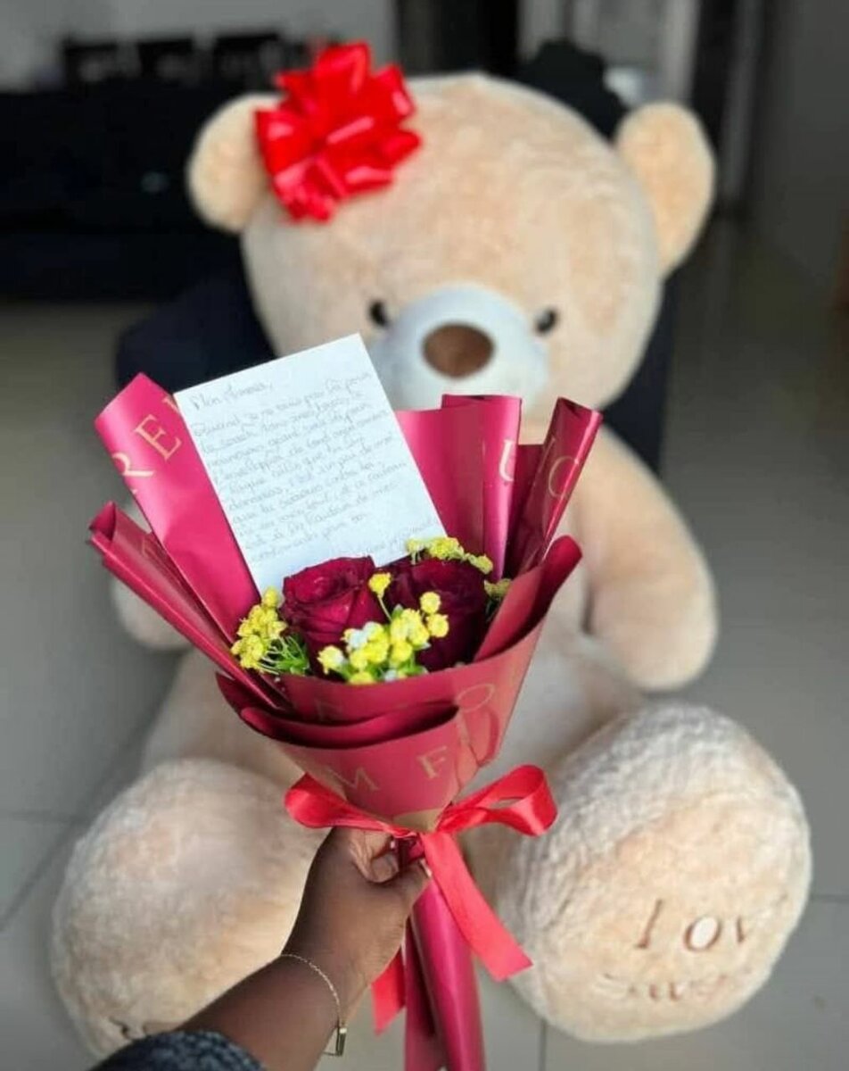 Découvrez l'ours en peluche géant parfait pour offrir un câlin réconfortant. Cet adorable compagnon, accompagné d'un bouquet élégant, est idéal pour des occasions spéciales comme les anniversaires ou les déclarations romantiques. Sa texture douce en fait le choix parfait pour enfants et adultes.