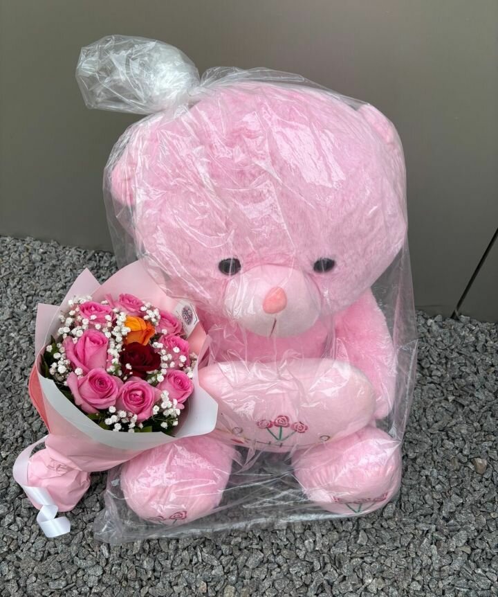 Un adorable ours en peluche rose accompagné d'un bouquet de fleurs, idéal pour offrir en cadeau à une personne chère. Cet ensemble comprend un ours en peluche doux et câlin ainsi qu'un bouquet de fleurs roses. Un cadeau parfait pour la Saint-Valentin, un anniversaire ou toute autre occasion spéciale. L'ours en peluche est emballé dans un plastique transparent, ce qui permet de voir la douceur et la beauté de l'ours.