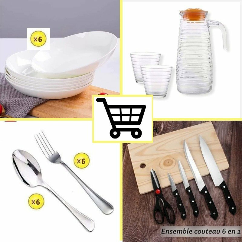 6 assiettes blanche 6 cuillères + 6 fourchettes Ensemble couteau Ensemble jarre + 2 verres