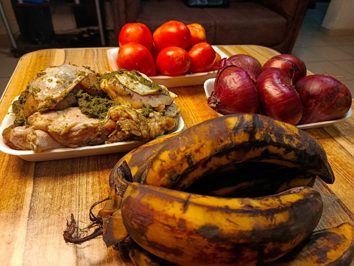 Ce pack contient de la banane plantain, 01 kg de tomates fraîches, 01 kg d'oignons et poulet de chair local assaisonné de 1,2 kg