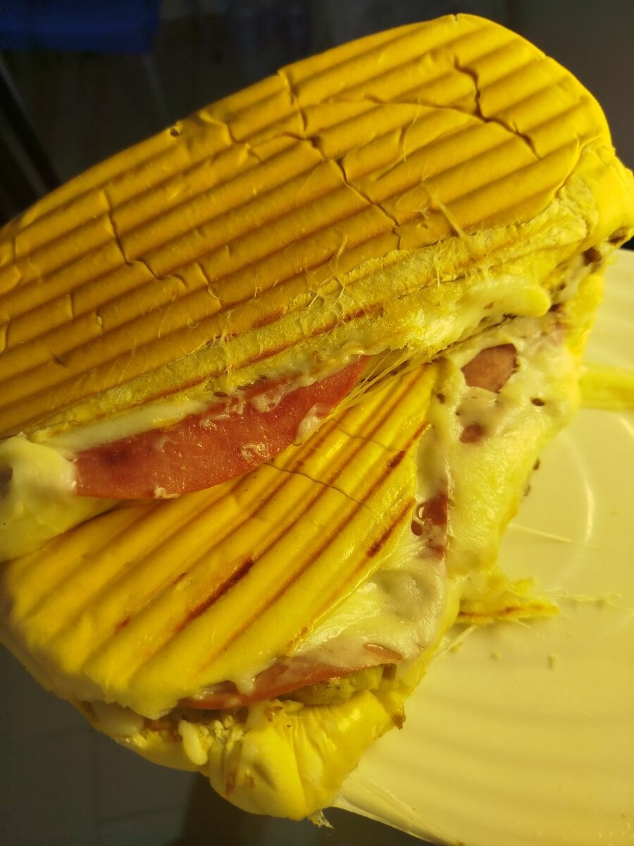 Savourez ce délicieux panini au fromage fondu a la viande de bœuf, oeuf, saucisson de volaille et boeuf et des rondelles de jambon de boeuf , parfait pour un déjeuner rapide ou un snack gourmand. Aplatir à la perfection, il offre une texture croustillante à l'extérieur et fondante à l'intérieur.