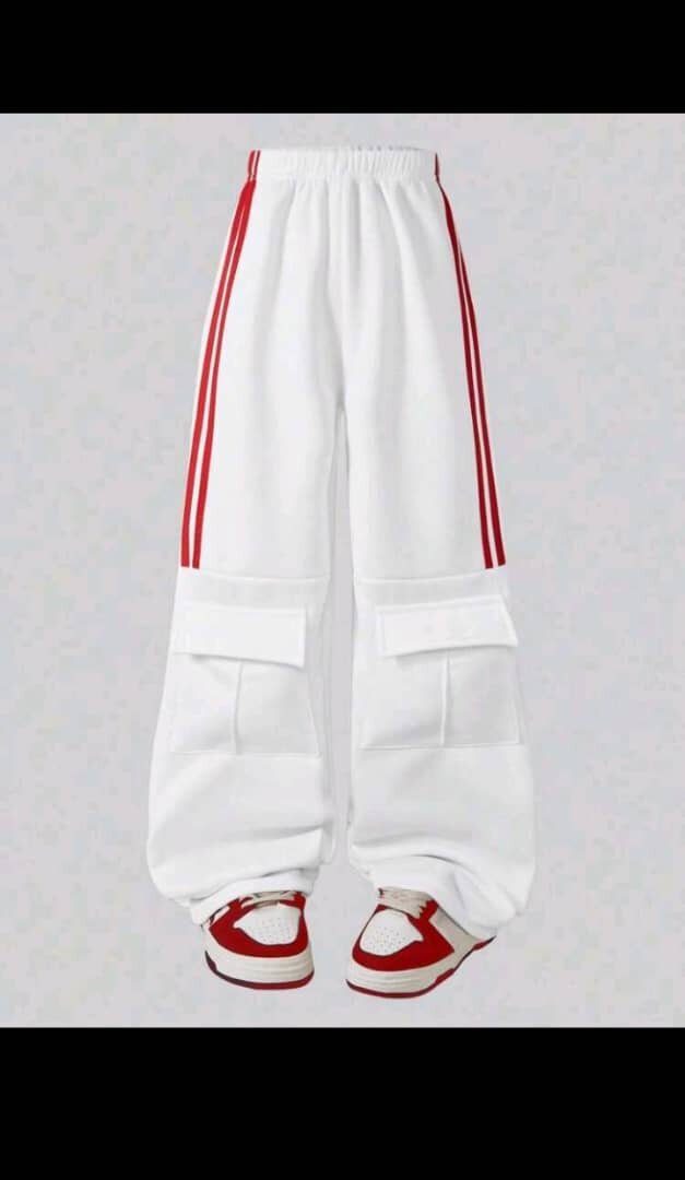 Pantalon cargo blanc tendance avec bandes rouges pour un style sportif et décontracté. Confort ultime avec une coupe ample et poches pratiques. Idéal pour une tenue streetwear ou pour le quotidien.