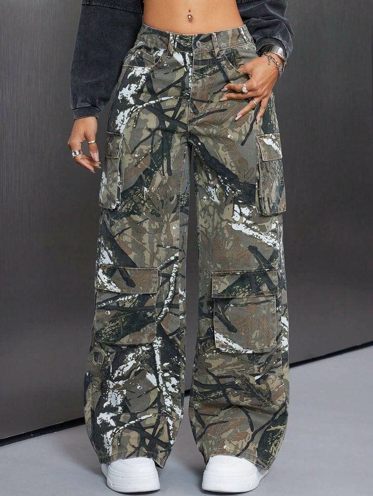 Pantalon cargo camouflage imprimé pour femmes. Conçu pour un confort optimal et un style tendance. Idéal pour les activités décontractées ou les looks urbains.