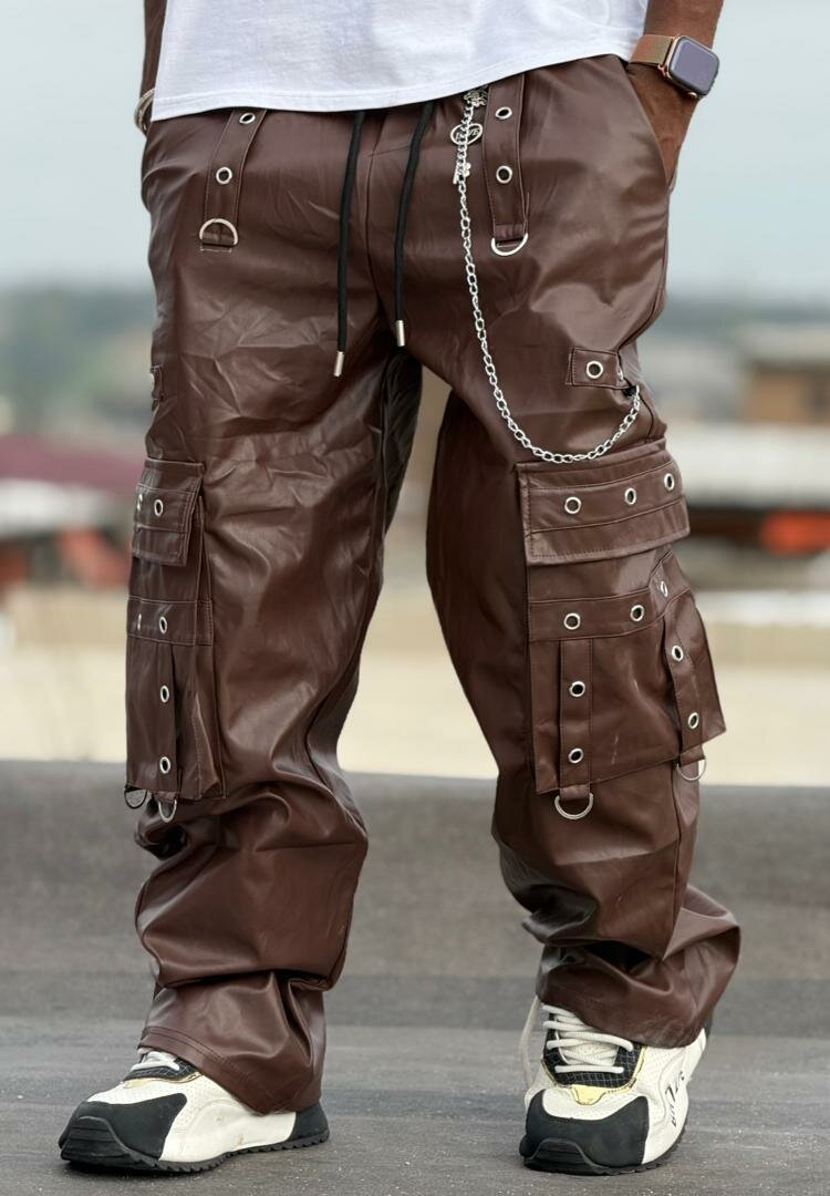 Optez pour un style audacieux avec ce pantalon cargo en similicuir marron. Doté de multiples poches pratiques et de chaînes décoratives, il est parfait pour une allure urbaine et tendance. Idéal pour des sorties, il ajoute une touche de caractère à n'importe quelle tenue.