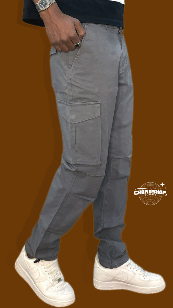 Pantalon cargo gris pour homme en tissu confortable, plusieurs poches. Idéal pour un look décontracté et moderne.
