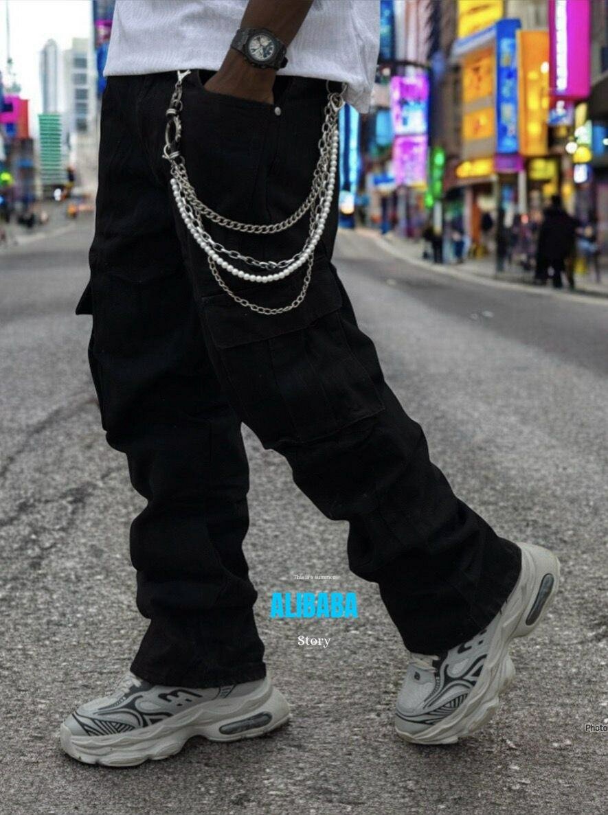 Adoptez un look urbain et moderne avec ce pantalon cargo pour homme. Sa coupe ajustée et ses chaînes décoratives ajoutent une touche d'originalité à votre tenue. Idéal pour un style décontracté ou pour faire la fête. Confortable et stylé, ce pantalon devient un incontournable de votre garde-robe. Disponible en plusieurs coloris pour s'adapter à toutes vos envies.