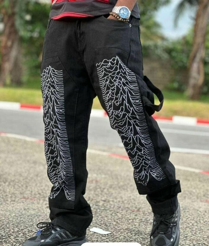 Pantalon cargo noir avec design graphique pour homme. Confortable et tendance, parfait pour un look décontracté.