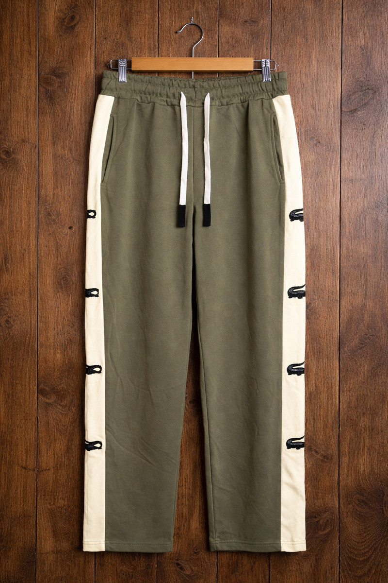 Pantalon de jogging vert avec détails blancs sur les côtés. Conçu pour le confort et la mobilité, il est idéal pour les activités sportives ou décontractées.