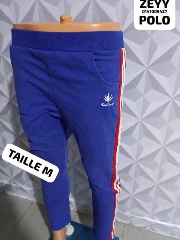 Pantalon de sport bleu confortable avec bandes rouges et blanches. Parfait pour les activités sportives ou l'usage quotidien. Taille M pour un ajustement optimal. Design moderne et décontracté. Idéal pour le gym ou les promenades en plein air.