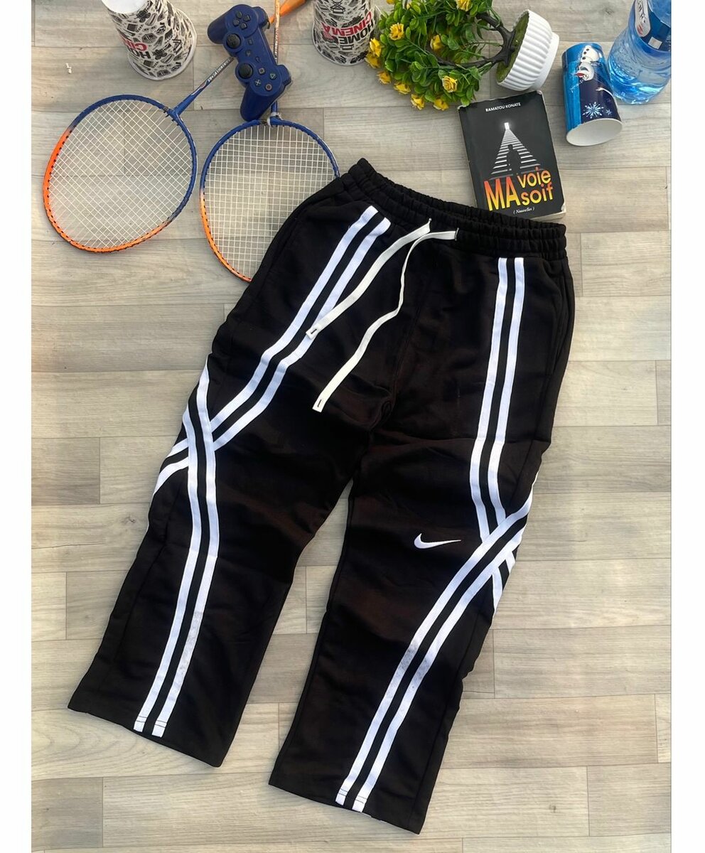 Pantalon de sport Nike noir avec rayures blanches sur les côtés. Conçu pour le confort et la performance, idéal pour les activités sportives et le quotidien décontracté. Fabriqué avec des matériaux de haute qualité pour une durabilité et une respirabilité maximales.