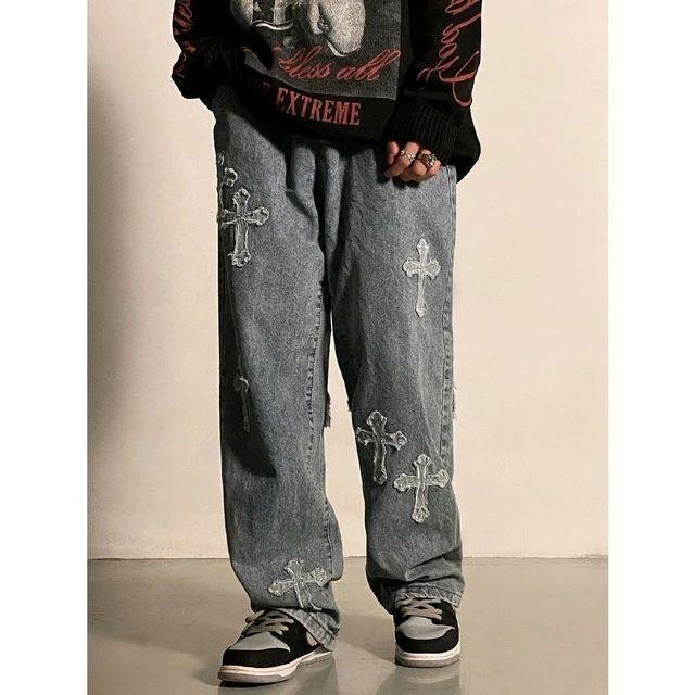 Découvrez notre pantalon en jean brodé croix, parfait pour un look urbain distinctif. Fabriqué en denim de haute qualité, il assure confort et style. Les broderies de croix donnent une touche unique et audacieuse, idéale pour exprimer votre individualité. Associez-le avec des sneakers pour un style streetwear moderne. Disponible en différentes tailles.