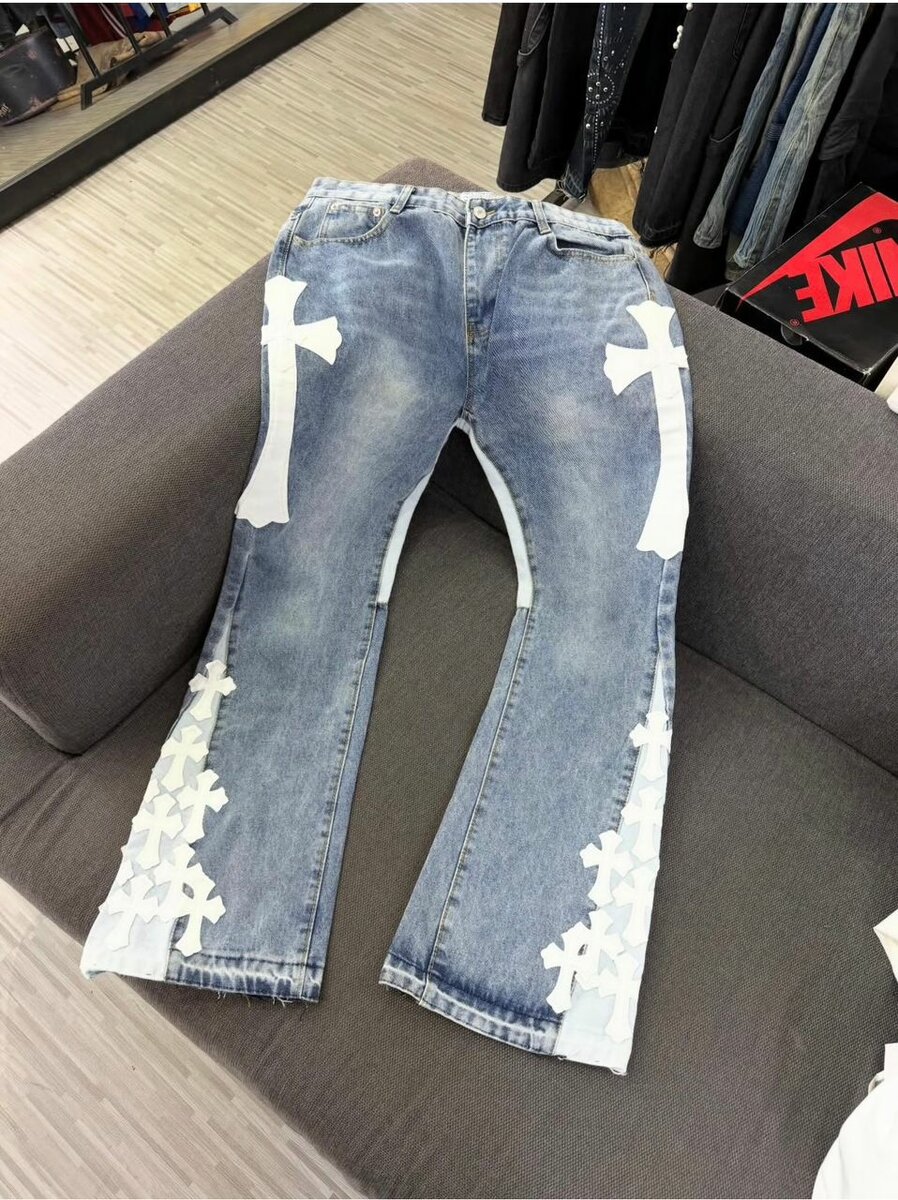 Découvrez ces jeans évasés uniques avec motifs croisés. Parfaits pour un look audacieux et original, ils combinent confort et style. Idéal pour sortir ou un style casual au quotidien. Fabriqués en denim de haute qualité, ces jeans sont faits pour durer et se démarquer.