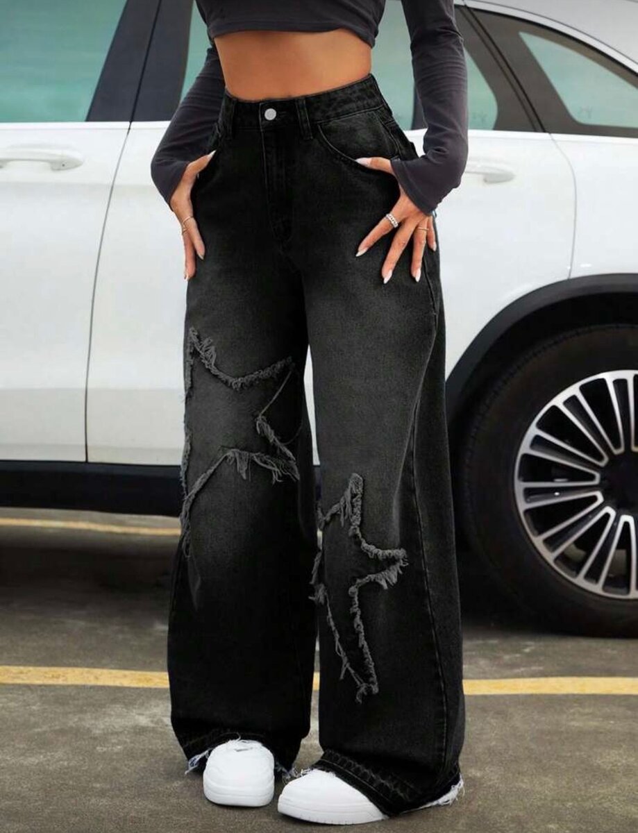 Ajoutez une touche d'élégance avec ce pantalon large noir à motifs étoilés. Conçu pour les femmes modernes, il offre confort et style. Parfait pour un look décontracté ou habillé.