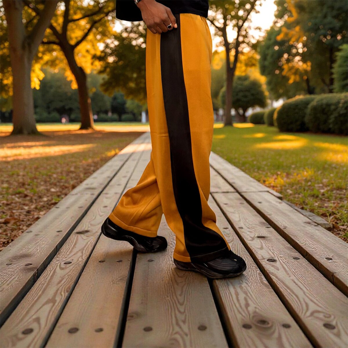 Pantalon homme marron moutarde avec une bande noire sur le côté. Confortable et élégant, idéal pour les looks décontractés ou chics.