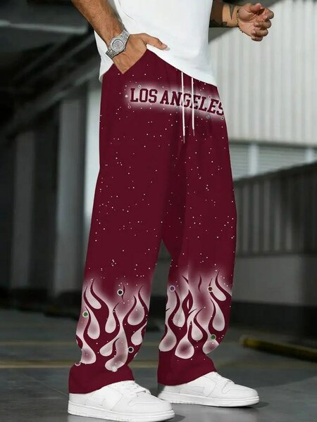 Pantalon large noir pour homme avec impression graphique blanche. Confortable et élégant, idéal pour un style urbain.