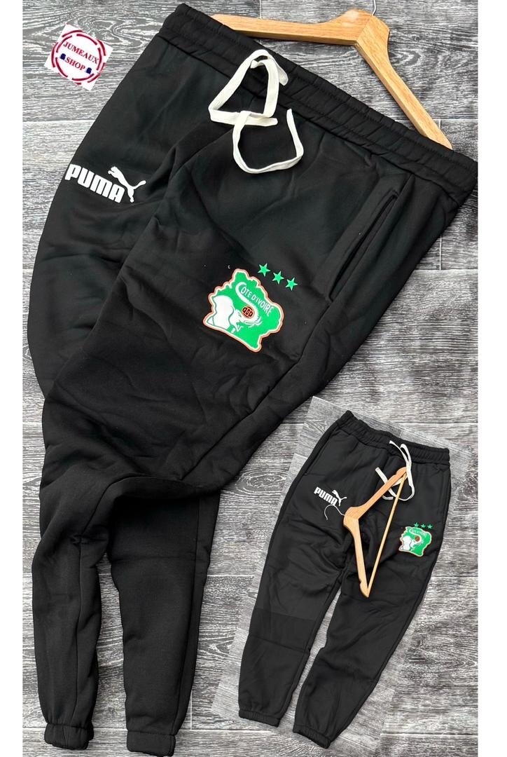 Pantalon de jogging Puma noir avec logo de football. Confortable et stylé pour l'entraînement ou le quotidien. Matériau doux, parfait pour les amateurs de sport.