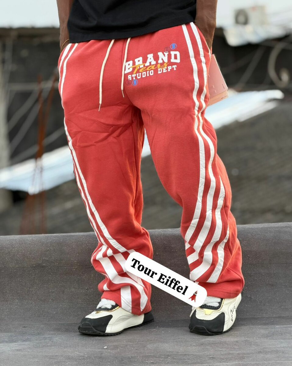 Pantalon rouge pour homme avec bandes blanches, confortable et tendance. Idéal pour les amateurs de mode streetwear.