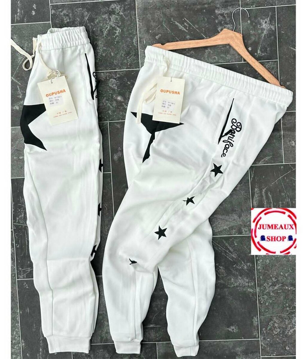 Découvrez ces pantalons de jogging blancs avec motifs étoiles noirs, parfaits pour un look casual et stylé. Conçus pour le confort et l'élégance, ils s'adaptent à toutes vos activités quotidiennes. Idéal pour les sorties décontractées ou une séance de sport.