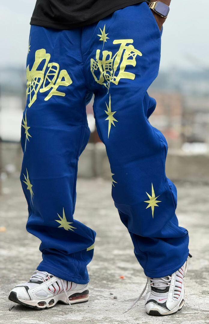 Pantalons streetwear avec motifs graphiques jaunes. Confortables et stylés, idéals pour une tenue décontractée et tendance. Parfaits pour les sorties en ville ou les occasions informelles.