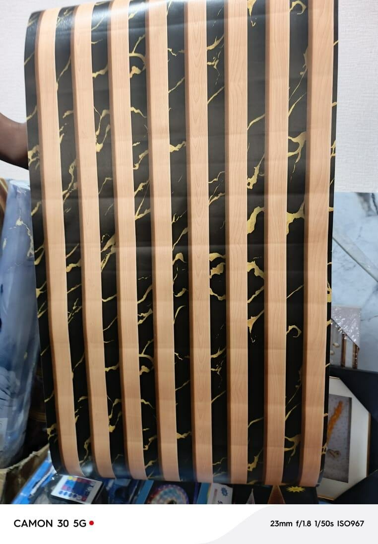 Apportez une touche moderne à votre intérieur avec ce papier peint rayé noir et bois, rehaussé de détails dorés. Idéal pour les salons, bureaux et chambres, il transforme vos murs en un véritable statement de style.