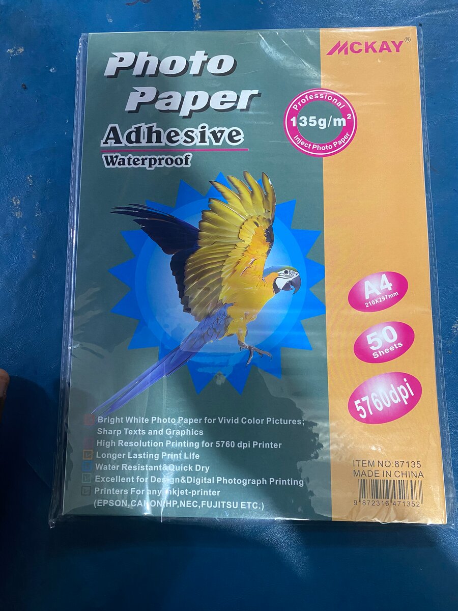 Papier photo adhésif McKay 135g/m², idéal pour des impressions couleur éclatantes. Résiste à l'eau et compatible avec imprimantes à jet d'encre. Parfait pour préserver vos souvenirs photos avec une netteté exceptionnelle.