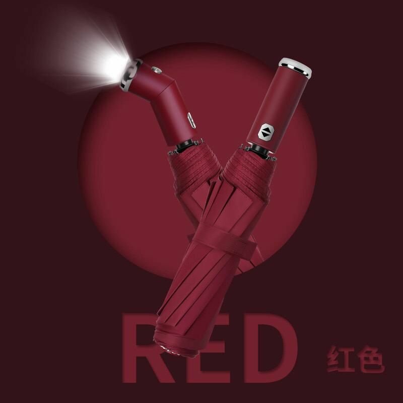 Parapluie pliant automatique équipé d'une lampe LED pour une visibilité optimale par temps sombre. Résistant et compact, disponible en noir, bleu et rouge.