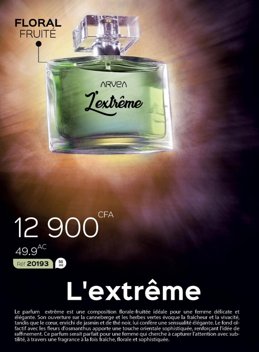 Découvrez le parfum envoûtant Arvea L'extrême, une fragrance florale et fruitée parfaite pour des moments inoubliables. Idéal pour toutes vos occasions spéciales, ce parfum vous enveloppe de son doux arôme unique.