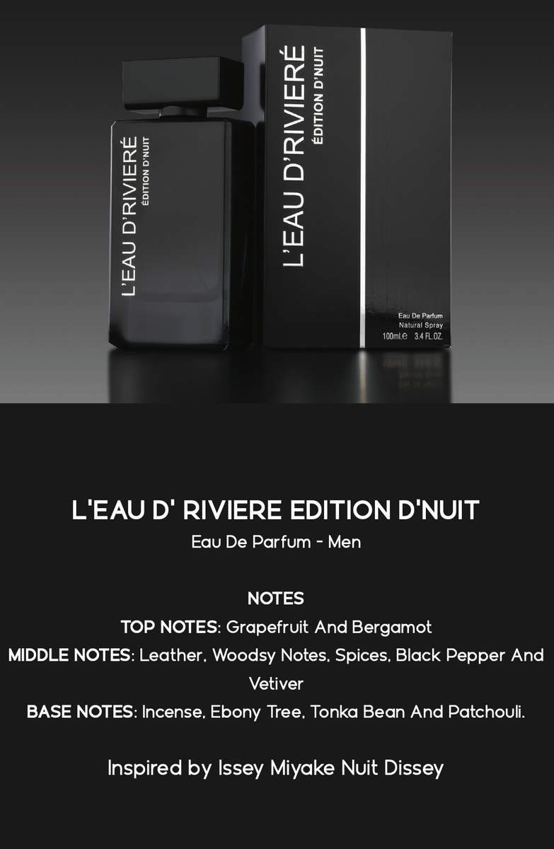 Découvrez L'Eau D'Rivière Edition D'Nuit, un parfum masculin captivant avec des notes de pamplemousse, cuir et encens. Idéal pour les soirées élégantes, ce parfum vous enveloppe de mystère et de sophistication.