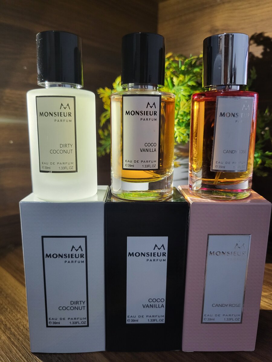 Découvrez le trio exclusif des parfums Monsieur: "Dirty Coconut", "Coco Vanilla" et "Candy Rose". Des fragrances luxueuses qui apporteront une touche d'élégance et de sophistication à votre quotidien. Idéal pour ceux qui aiment varier selon les occasions, de doux accords de noix de coco, vanille et rose. Parfait pour un cadeau élégant et mémorable.