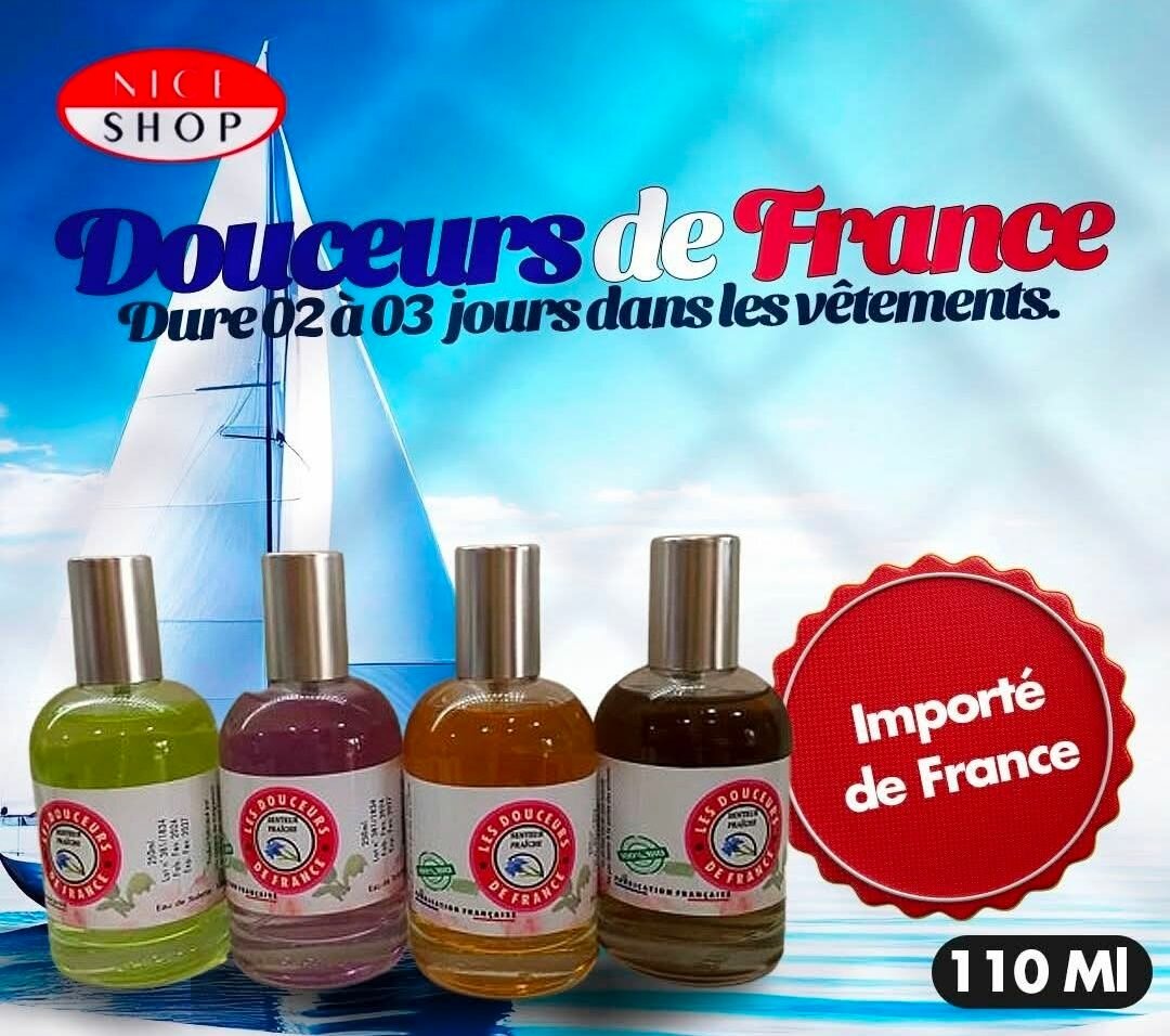 Découvrez le parfum textile Douceurs de France, idéal pour rafraîchir vos vêtements. Sa fragrance durable reste jusqu'à 3 jours, parfait pour les garde-robes et textiles d'intérieur. Importé de France et disponible en 110 ml.