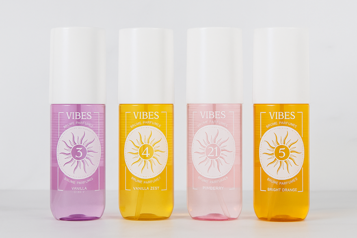 Découvrez le parfum VIBES : un assortiment élégant de fragrances uniques incluant Vanille, Zeste de Vanille, Pastèque et Orange Éclatante. Idéal pour toutes les occasions, ces parfums offrent une expérience sensorielle inoubliable. Parfait pour un usage quotidien ou comme cadeau spécial. Apportez une touche de fraîcheur et d'élégance à votre routine.