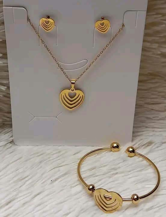 Élégante parure de bijoux dorés comprenant collier, boucles d'oreilles et bracelet. Idéale pour sublimer vos tenues. Parfaite pour offrir ou se faire plaisir, elle apportera une touche d'éclat et d'élégance à votre look.