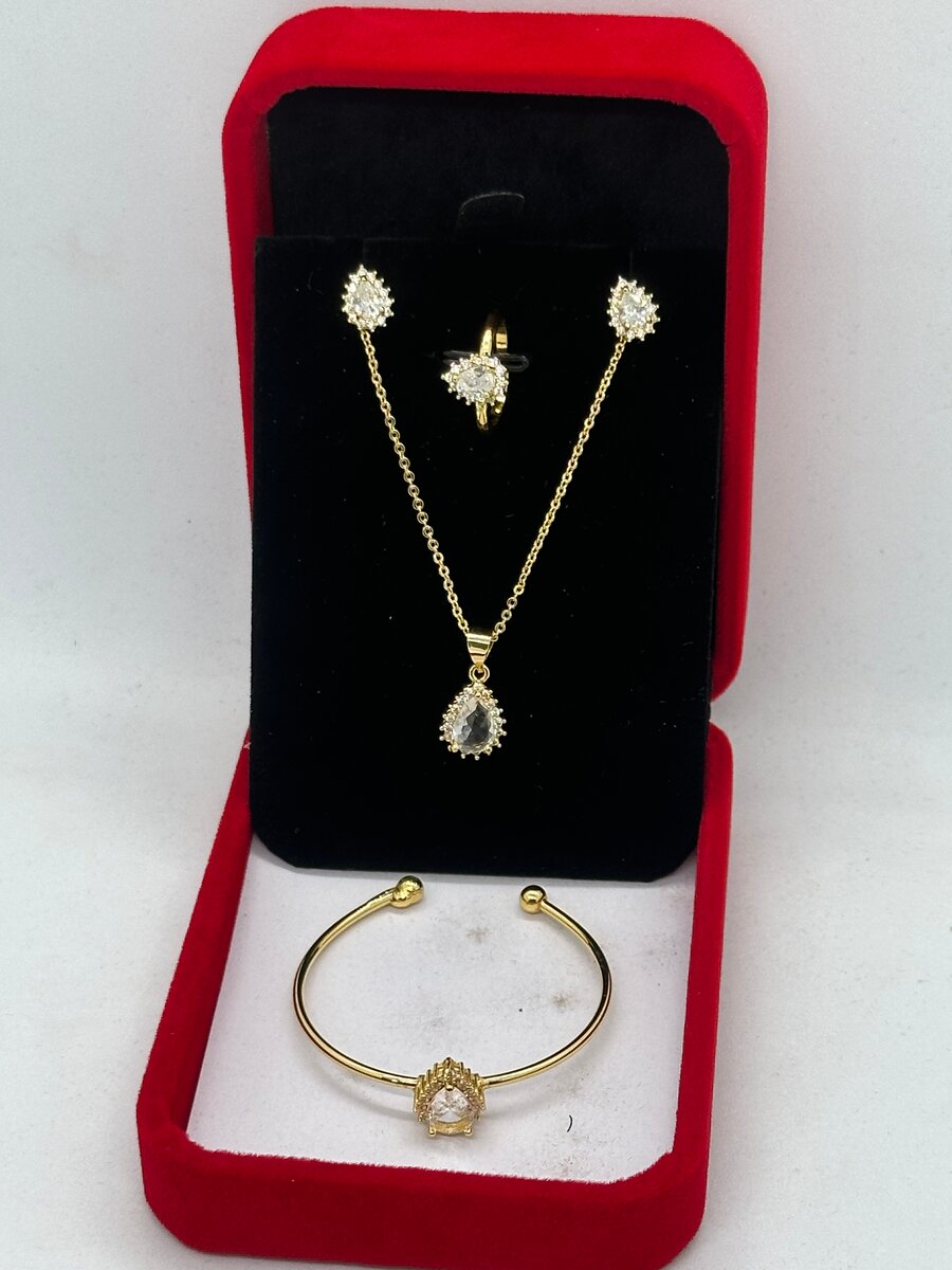 Découvrez cette magnifique parure de bijoux plaqués or, incluant un collier, boucles d'oreilles et bracelet. Parfaite pour les occasions spéciales, ajoutant élégance et raffinement à votre tenue. Un cadeau idéal qui ravira toutes les amatrices de bijoux raffinés.